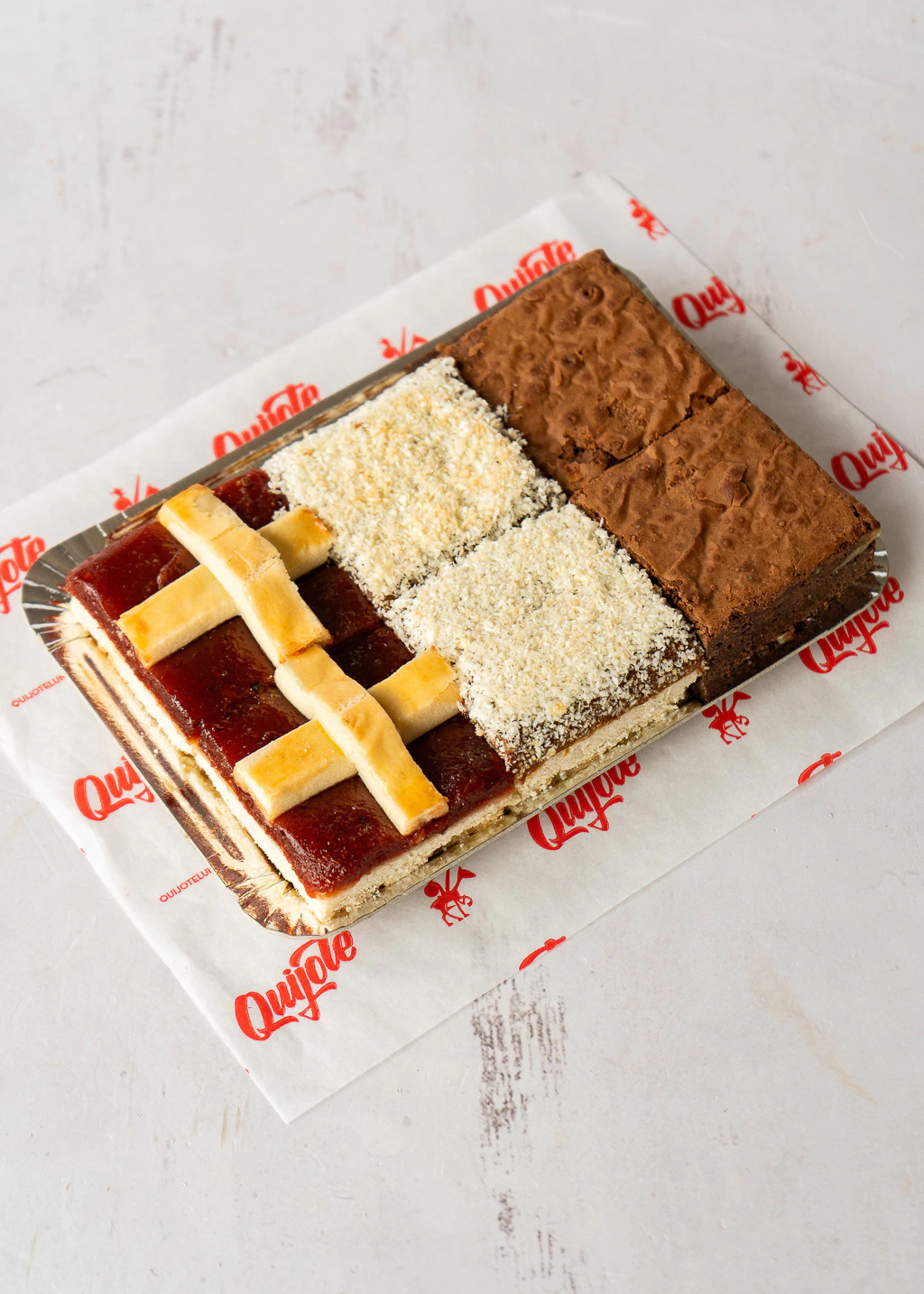 BANDEJA DE 6 CUADRADOS DE 6X6CM: 2 DE BROWNIE, 2 DE COCO Y DULCE DE LECHE Y 2 DE PASTA FROLA.